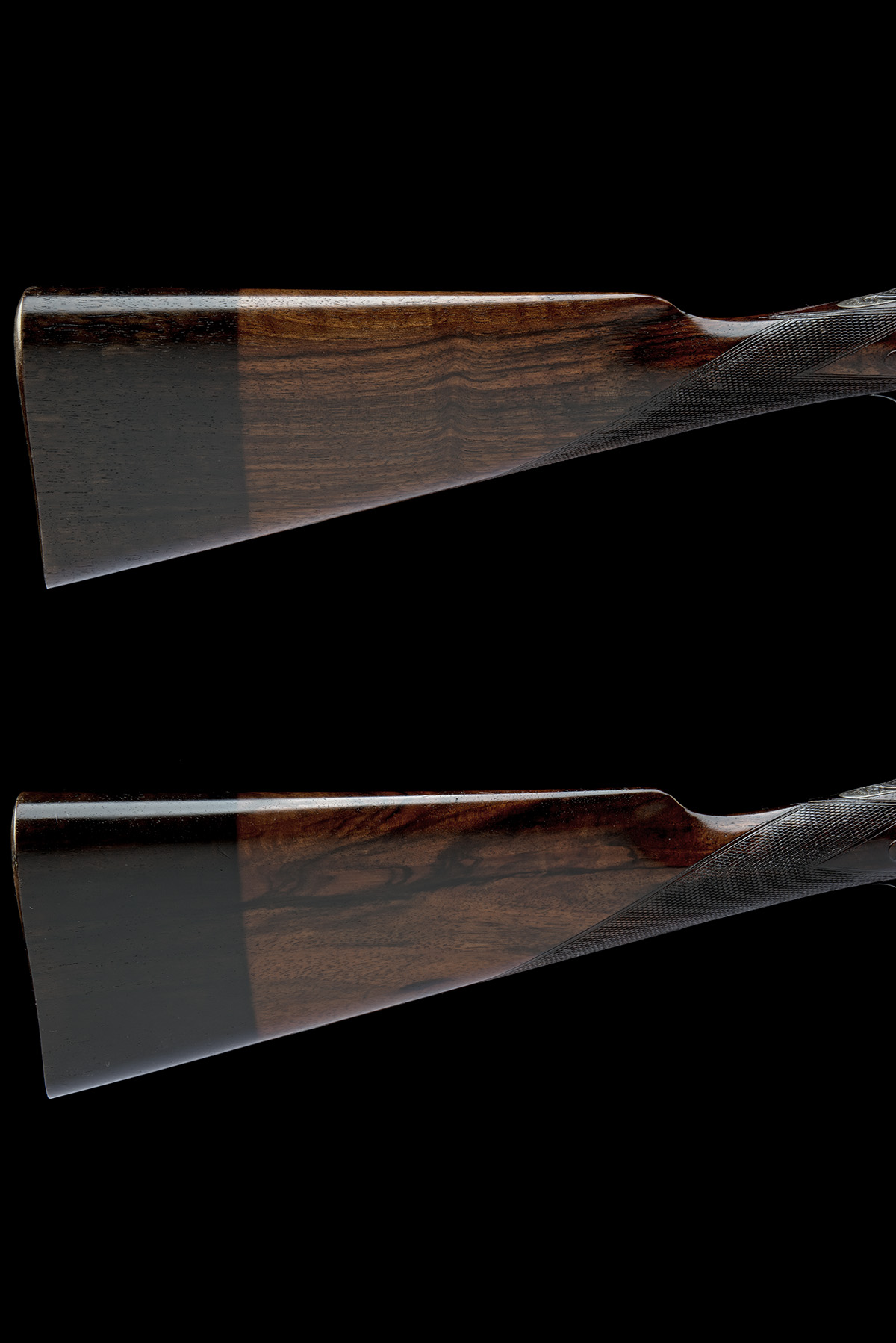 for 1928, 27in. nitro barrels (No.1 reproved in 1982), ribs engraved 'WILLIAM EVANS, 63, PALL MALL. ST. JAMES'S. LONDON.' and gold-inlaid '1' and '2' at the breech ends, 2 1/2in. chambers, bored approx. 1/4 and 1/2 choke, No.2 right bore dimension marginal and wall thickness at 18, treble-grip actions with removable striker discs, toplevers gold-inlaid '1' and '2', automatic safeties with gold-inlaid 'SAFE' details, fine acanthus scroll engraving with beaded bordering, retaining much colour-hardening and finish, 14 3/8in. stocks (stained at butts from a boot), weight 6lb. 1oz. (No.1) and 6lb. (No.2)