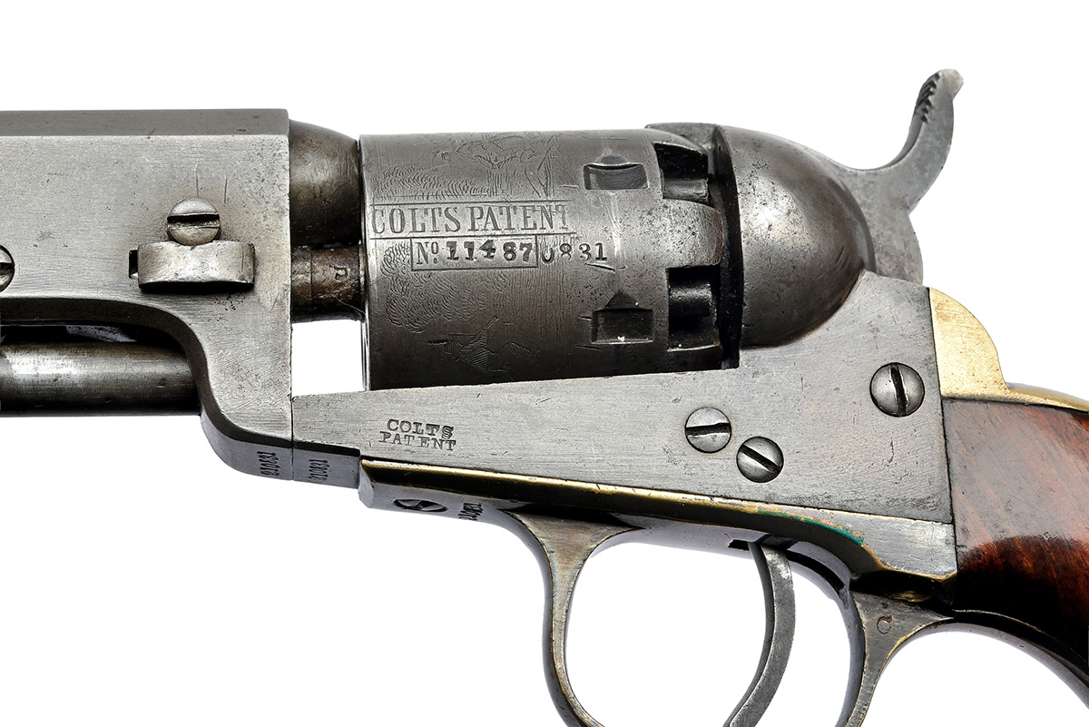 for 1862, with octagonal 6in. barrel, the top-flat signed 'ADDRESS COL. SAML. COLT NEW-YORK U.S. AMERICA', bead fore-sight, period but miss-numbered wedge, open iron frame with traces of colour, six-shot roll engraved cylinder, single action mechanism, strong amount of silver plated finish remaining to the trigger guard bow and tang, the back-strap cleaned to brass, smooth flared walnut grip, the left heel carved with three notches and articulated under-barrel rammer