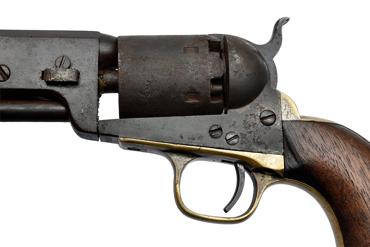 the revolver manufactured in 1863, with octagonal 7 1/2in. barrel signed on the top-flat 'ADDRESS COL. SAML. COLT NEW-YORK U.S. AMERICA', bead fore-sight, matching number barrel wedge, open iron frame marked 'COLTS PATENT' (rubbed), six-shot cylinder with traces of roll engraved scene, single action mechanism, brass grip-straps with traces of plating in sheltered areas, smooth flared walnut grip (worn, period losses at toe and head on left side) and articulated under-barrel rammer, iron surfaces darkly stained with some pitting throughout, in a period leather full-flap belt holster in the Confederate style with tooled borders and leather sliding tab closure (some crazing and stitching loss)