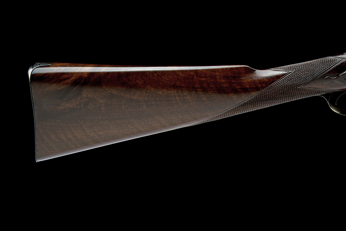 built on the 1862 patent with use number '28', with 29 3/4in. browned barrels marked 'DAMASCUS' to the underside and signed on the top-rib 'JOSEPH NEEDHAM PATENT 26 PICCADILLY LONDON', engraved starbursts around the pin apertures, border and scroll engraved action, border scroll and gamescene engraved bar-action locks, short side-lever to the right side opening the gun and placing the hammers on half-cock, chequered walnut butt-stock (cracked and repaired at wrist), iron furniture, chequered walnut splinter fore-end, in a period leather covered two-tier oak casing lined and compartmented in green baize, lift out tray for the stock and action, the lower tray for the barrels and ammunition