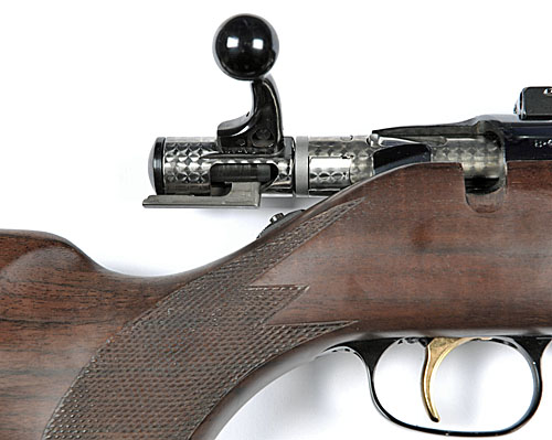 60cm. blued nitro barrel, blued receiver fitted with a Schmidt & Bender 1 1/2-6x telescopic sight in Apel quick detachable mounts, 13 1/2in. figured pistolgrip stock including 3/4in. ventilated rubber recoil-pad, raised Monte Carlo cheek-piece, chequered grip and fore-end, gold-washed trigger, blued sling mounts, and brown leather Parsons sling.