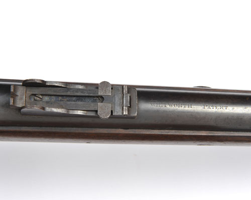 dated '1860', with 39in. blued barrel (bore excellent) engraved 'WHITWORTH PATENT' and retained by two blued barrel-bands and one barrel-key, no bayonet bar, rear-sight calibrated to 1,100 yards, blued tang, case-hardened lock signed 'WESTLEY RICHARDS & CO. / 1860', walnut full-stock, brass heel-plate and trigger-guard, iron sling mounts, iron ramrod, the whole retaining much original finish throughout, Birmingham proof marks, in a wooden transit case, probably original (catches and handle replaced).