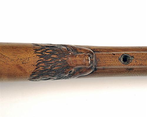 circa 1880, possibly German or American, with heavy octagonal 20in. smooth-bore barrel, dove-tailed blade fore-sight, adjustable standing notch rear-sight, twist sideways to load action, plain cylindrical air-chamber with aperture for the detachable crank-handle on the right-hand side, long top-tang with provision for peep-sight (missing), Swiss-style butt with raised cheek-piece, Swiss heel-plate, nickel scrolled trigger-guard with hogs-bristle set trigger (at fault), three-quarter length fore-end carved with a lions mask, action at fault