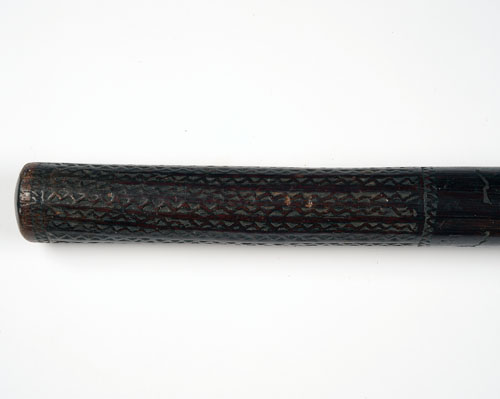 first half of the 19th century, approximately 44 1/2in. overall with geometric carving to the 'grip' portion for the first 8 1/2in, the root-ball head with random protrusions, each inlaid with a bone 'sun', 'moon' or 'star', some age splits along the length of the shaft and around the head