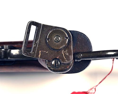 circa 1944, with 18in. barrel, fore-sight with protectors, no provision for bayonet, adjustable aperture sight to rear of receiver, folding wire half-stock with wood pistol-grip, leather cheek-piece and holder for oil-bottle (missing), wood fore-end and cover, detachable box magazine
