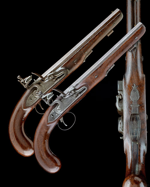 A PAIR OF 25-BORE FLINTLOCK DUELLING-PISTOLS, no visible serial numbers,