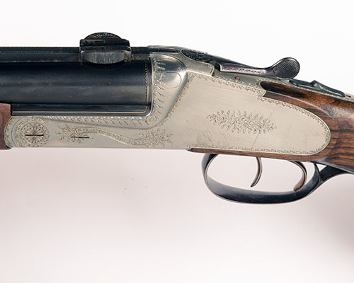 25in. nitro barrels with matt sight rib, open sights and ramp-mounted blade fore-sight, the breech end with gold line details and fitted with quickly-detachable telescopic sight mount bases, treble-grip action with side-bolsters, gold cocking-indicators, manual safety, removable striker discs, set front trigger, border engraving with some acanthus scroll detailing, bright finish overall, 14 1/8in. figured pistolgrip stock with palm swell, cheekpiece, horn pistolgrip-cap, sling swivels and including applied 7/8in. ventilated rubber recoil pad, semi-beavertail fore-end with Deeley & Edge patent release, weight 8lb. 6oz., in a Browning universal case with fitted foam interior