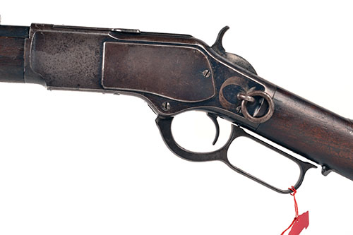 for 1892, with round 20 1/8in. barrel signed 'WINCHESTER'S REPEATING ARMS NEW HAVEN CT. KINGS IMPROVEMENT PATENTED MARCH 29 1866 OCTOBER 16 1860', block and blade fore-sight, elevating ladder 'carbine' rear-sight, plain receiver with sliding dust-cover and side-mounted saddle-ring, top-tang marked 'MODEL 1873', walnut straight-hand butt-stock with iron 'carbine' heel-plate fitted with sliding central trap-door, brass cartridge-lifter with calibre designation, plain walnut fore-end with single iron barrel-band, under-barrel full-length magazine, the whole with traces of finish
