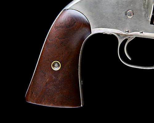 circa 1872-74, with round 8in. barrel, the raised sighting rib signed and marked with patents to 'AUG 24. 69', fluted cylinder, plain break-open frame with automatic ejection and manual over-ride, 'un-notched' hammer and smooth walnut flared grips with flat bases, the whole being an older re-nickel TOGETHER WITH an un-associated green leatherette case with rounded corners and gilded borders, the interior blocked for this pistol in the continental style and lined in green velvet (hinges at fault)