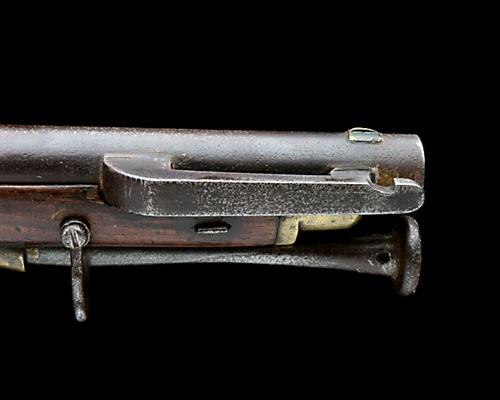 for 1823, with deeply rifled 30 1/4in. barrel marked at breech '32', applied nickel blade fore-sight, rear-sight with one standing and one folding leaf, plain top-tang with pointed tail, flat, slightly curved bevel-edged borderline engraved lock signed 'SILVESTER', stepped-tail, roller-bearing to the frizzen-spring, walnut straight-hand full-stock, raised cheek-piece, brass furniture including rectangular patch-box to the right hand side of butt, trigger-guard bow with raised finger-spur and serpentine side-plate, ramrod channel with expansion slot, iron swivels and replacement iron ramrod (from a Brunswick Rifle), some old drying splits to wood, ramrod thimbles worn