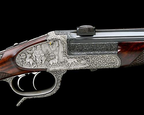 action incorporating Franz Jaeger 1906 patent 'kippblockverschluss' sprung breechblock, manual safety, set triggers, action flat signed 'Scheiring jun.', the whole carved in high relief with bold germanic scrollwork, the left sideplate depicting Diana, Goddess of hunting, with hounds and a stricken red stag her crescent moon highlighted in gold, signed 'G. STOGNER', on the right St. Hubertus, flanked by hunting hounds, crossbow in hand, kneeling in supplication to the Hubertus hirsch, the crucifix highlighted in gold, the underlever finely carved with a monogram, the top tang with a hive, old silver finish, 14 1/2in. highly-figured pistolgrip stock with slight hogsback comb, sculpted cheekpiece, sling swivels, sculpted horn pistolgrip-cap, fishscale chequering and including 1/2in. rubber recoil pad, weight 7lb. 8oz. (5.6x50R) and 8lb. 7oz. (.270 WM), in its fitted lightweight leather case with provision for both barrels and telescopic sights