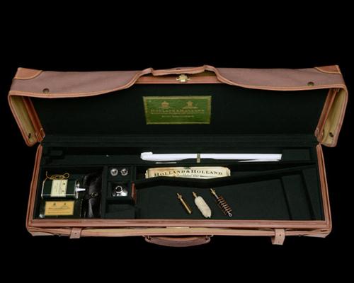 28in. nitro chopperlump barrels, the rib finely engraved with stylised floral motifs at the breech end and engraved in script ' THE ROYAL', the tubes engraved 'HOLLAND & HOLLAND. 33, BRUTON STREET, LONDON.', 2 3/4in. chambers, bored approx. 1/4 and 1/2 choke, automatic safety with gold-inlaid 'SAFE' detail, gold-inlaid cocking-indicators, rolled-edge triggerguard, the action, lockplates and furniture finely engraved with Holland & Holland ribbon scroll engraving, the makers name in scrolling banners on the lockplates, the underside with an elaborate cartouche engraved 'THE ROYAL', retaining virtually full original colour-hardening and finish, 15 1/4in. well-figured stock, weight 5lb. 13oz., in its lightweight leather case with accessories and canvas and leather outer