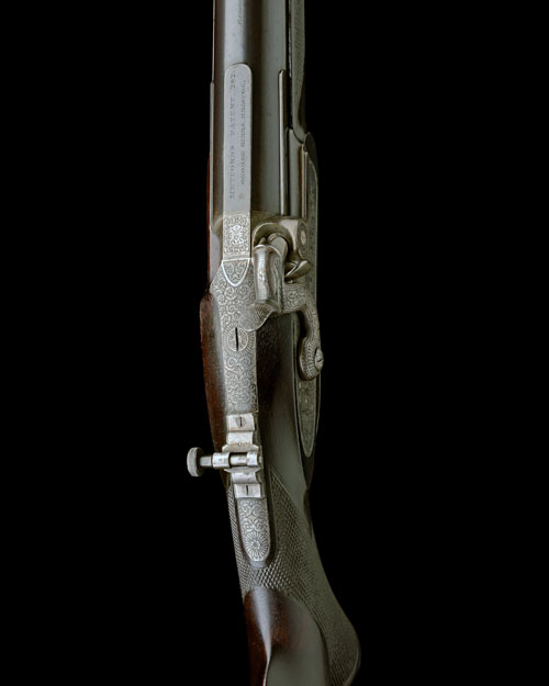 circa 1860, with blued tapering 36in. barrel (lightly faded), the short-rib at breech signed 'METFORD'S PATENT 282' above 'GEORGE GIBBS BRISTOL', the top of barrel signed 'PARKER FIELD & SON, 233 HIGH HOLBORN, LONDON', stud at muzzle for detachable ramrod guide, large dove-tailed threaded fore-sight block with thumb-wheel locking screw, folding ladder rear-sight, squared patent colour-hardened breech-block with scroll engraving to the top-flat with central 'EM' monogram, engraved platinum plug with scroll engraved surround, moulded side-bolster, fully border and scroll engraved long top-tang fitted with a base for a vernier tang-sight, border and scroll engraved bar-action lock signed 'PARKER FIELD & SON', border and scroll engraved dolphin-headed hammer with fishscale engraving to spur and chequered thumb-piece, chequered walnut full pistol-grip half-stock, chequered iron heel-plate with scroll engraved details, circular silver escutcheon to underside of butt, moulded horn pistol-grip cap, blued border and scroll engraved trigger-guard tang and bow, chequered trigger-blade, engraved dumbell barrel-key escutcheons, rounded horn fore-end tip and no provision for ramrod, the whole retaining much original finish and colour TOGETHER WITH its 'Parker Field & Sons' oak storage case, compartmented and lined in green baize and containing a two-piece loading rod with detachable ball handle and detachable loading tip, a leather tie-on butt-pad, a false muzzle with detachable nickel guide, a 'BARTRAM & CO' white metal powder flask with patent nozzle and marked 'EXTRA QUALITY', a turn-screw, a spring clamp, a nickel snail cap dispenser signed 'SYKES', a brass nipple primed engraved with the monogram 'MHB', a tin of Parker Field wads, a blued patch guide, a bone nipple pot, sundry cleaning items and three patch cutting profiles and COMPLETE WITH its black leatherette sight box marked in gold-blocked letters 'METFORD RIFLE SIGHTS, G. GIBBS, BRISTOL' containing a full complement of sights for the rifle including three varient fore-sights (one with eight interchangeable elements), a vernier tang sight and a nipple key with detachable screw-driver blade