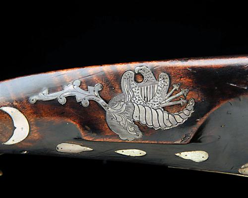 circa 1835, with octagonal 41 1/4in. rifled barrel, dove-tailed brass boat-shaped fore-sight, dove-tailed iron standing notch rear-sight, drum and nipple breech, flat borderline engraved lockplate with scroll engraved detail signed 'JOSEPH GOLCHER', dark stripy-maple full-stock with 'Roman-nose' butt, the wrist inlet with silver crescent moons bracketing a masonic style compass and square, pierced open scroll-work brass patch-box and hinge, the lid scroll engraved, crescent brass heel-plate with radiused heel-spur and long flat toe-plate, finely engraved inlet silver American eagle perched on a branch and clutching a trio of arrows to the cheek-piece, finely engraved standing Native American wielding a tomahawk behind together with a hunting dog 'emerging' from the heel-plate, the majority of the rest of the stock inlet with various silver geometric shapes including tear-drops and hearts, brass scroll-engraved 'baton' device inlet to underside of fore-end, double set triggers, brass ramrod thimbles and brass tipped wood ramrod