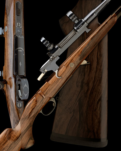25 3/4in. fluted nitro reproved barrel (in 2015), block-mounted chequered open sights with folding leaf sight with silver sight lines and decorative line detailing, ramp-mounted bead fore-sight similarly embellished, double square bridge receiver mounted with telescopic sight rings in quickly-detachable mounts and decorated with simple scrolled line details in silver, the bolt decorated en suite and with band of chequering surrounding a centrally engraved flower, floral engraved recoil blocks, quickly-detachable take-down mechanism, hinged floorplate with push button release and inlaid with the makers name, blacked finish overall with silver border line detailing, highly-figured pistolgrip stock with sling eyes, skeletal steel pistolgrip-cap, darkwood finial, 14 1/4in. pull including 3/4in. rubber recoil pad