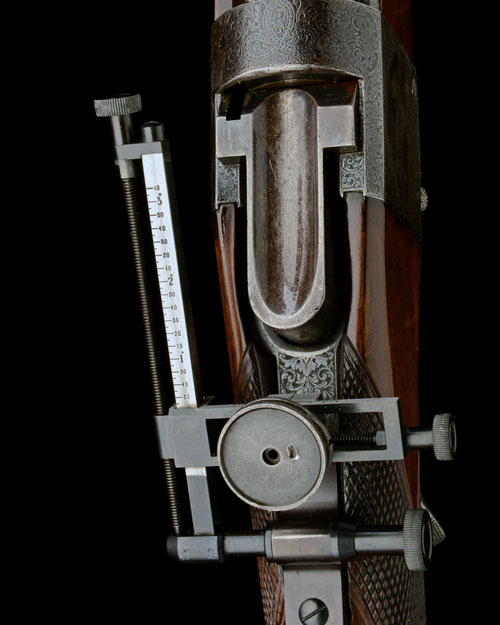 27 3/4in. octagonal black powder only barrel with Henry patent rifling, broad full length raised rib gold-inlaid in gothic script 'WESTLEY RICHARDS & CO. LIMITED. BIRMINGHAM.', the side marked 'HENRY'S PATENT RIFLING' and the breech end with 'RIFLE FOR NO.2 CASE', long range express sights, eight leaves with white-metal inlaid sight lines and marked from 100 to 800 yards and folding tangent sights marked to 1500 yards, the underside with provision for cleaning rod (present), early Deeley & Edge (improved American 1874 patent) transition model action with one piece triggerguard / underlever with breech block mounted trigger, manual sidelever safety, single-legged extractor, the action and furniture profusely engraved with bold scrolling acanthus with beaded borders, the action with central scrolling banners engraved 'WESTLEY RICHARDS & CO. LIMITED LONDON' on the left, with small 'Deeley & Edge Patent' detail, on the right a vignette of a running roe buck with acanthus scroll and beaded ribbon borders, the underlever with shell motif at tip, top tang with later aperture rear sight, retaining traces of original finish, fore-end with cross-pin fastening and fully engraved white metal finial, 14 1/4in. stock with sling eye, white metal or nickel plated heel and toe plates fully engraved with floral and acanthus scroll motifs, weight 9lb. 5oz