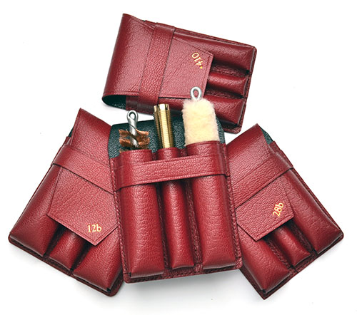 the interior lined in claret goatskin leather, the lid interior gold tooled with a single line detail and central representation of a James Purdey & Sons gun case trade label with the triple Royal Warrant and the Audley House address, fully fitted and compartmented to accommodate a full range of Purdey named accessories spanning 12-bore through to .410 calibres, the upper level comprising four pairs of nickel-plated snapcaps, four two-piece cleaning rods, four nickel-plated chamber brush heads, (each specific for 12, 20, 28 and .410 calibres), a horn and nickel-plated chamber brush handle, three horn-handled turnscrews and matching horn-handled brush, nickel-plated oil bottle and striker pot, the removable cleaning rod tray revealing a second tier containing leather pouches with individual cleaning heads, each pouch gold-tooled with the calibre designation, the removable turnscrew tray also revealing a second tier, the whole housed in fine leather attache style case with leather reinforced corners and with brass lock, brass handle rings and strap buckles