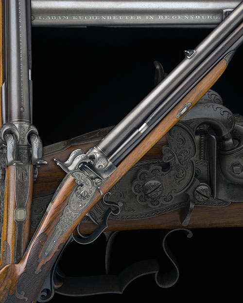 circa 1850, with browned 30in. rifled barrels, the left hand rib convex, the right hand sunken with provision for ramrod (present), the top of barrel signed in silver 'ADAM KUCHENREUTER IN REGENSBURG' together with an oval silver poincon of a standing stag, bead fore-sight on a moulded ramp, dove-tailed rear-sight with additional folding leaf, white metal bands at breech, carved and engraved percussion fences and snails, screwed plugs with square sockets, borderline and scroll engraved top-tang with central 'cigar-band' rectangular escutcheon, border and scroll engraved back-action locks with moulded irregular edges and rotating hammer-block safes forwards of the hammers, figured walnut half-stock with finely chequered wrist, raised roll-edge cheek-piece, carved wood patchbox to right hand side, iron heel-plate with scroll engraved detail, moulded horn trigger-guard tang cover, scrolled trigger-guard bow, set trigger to bottom barrel, provision for sling, the whole expertly restored