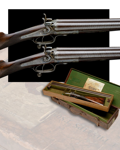 30in. black powder only bold damascus barrels, ribs engraved 'BOSS & CO. 73 ST. JAMES'S STREET. LONDON.', and '1' and '2', 2 1/2in. chambers, bored approx. true cyl. in all, Jones patent rotary underlevers, carved percussion fences, rebounding back-action locks, border engraving, retaining some original colour-hardening, 13 3/4in. well-figured stocks including steel buttplates, weight 6lb. 14oz., in their leather two-tiered case, the lid outer marked 'C.J. PHILLIPS. ESQ.'