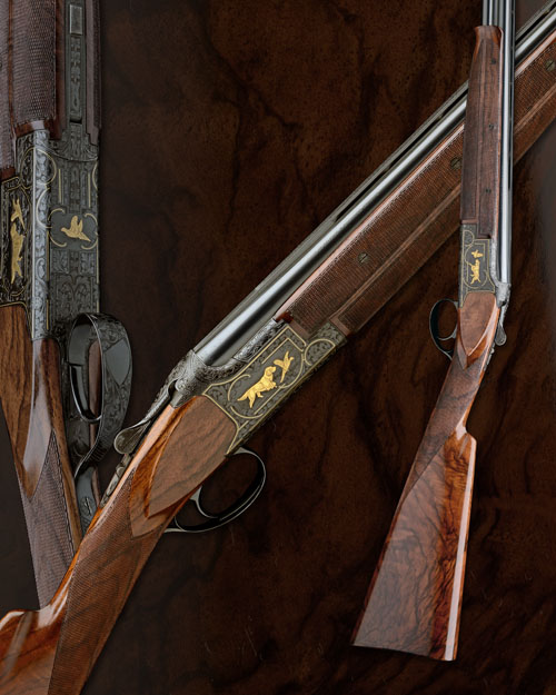 28in. nitro chopperlump barrels with 5mm ventilated matt top-rib, 2 3/4in. chambers, bored approx. 1/4 choke in both, detachable one-piece fore-end, hold-open toplever, manual safety with integral barrel selector switch, gold-inlaid 'S', 'U' and 'O' details, blued action carved in relief with flowing foliate scrollwork on a matted background with stippled standing breech, gold line detailing and relief engraved and gold-inlaid with scenes of hound and fowl, signed 'L. ERNST', 14 3/8in. highly-figured straight hand stock, weight 6lb. 4oz.