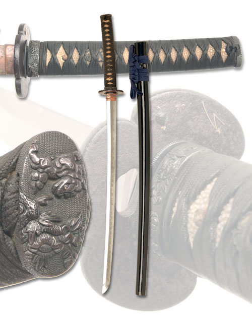 late 18th century, with 23 3/4in. blade (some cleaning and edge-nicks), prominent 'hamon', copper 'habaki', four lobed iron 'tsuba' with small gilded detail of seeds, grass and pine-cones, single 'mekugi-ana', in a black laquered 'saya'
