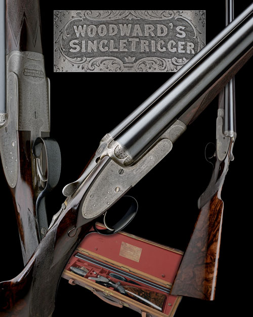 29in. nitro reproved Whitworth steel chopperlump barrels, rib engraved 'JAMES WOODWARD & SONS. 64. ST. JAMES'S STREET. LONDON. S.W. MADE OF SIR JOSEPH WHITWORTH'S FLUID PRESSED STEEL', 2 1/2in. chambers, bored approx. 1/4 and 1/2 choke, arcaded fences, automatic safety with gold-inlaid 'SAFE' detail, removable striker discs, gold-inlaid cocking-indicators, best fine border and scroll engraving, the underside with an elaborate cartouche relief-engraved 'WOODWARD'S SINGLE TRIGGER', retaining very slight traces of original colour-hardening and finish, 15in. highly-figured semi-pistolgrip stock (small crack at head) including 1 3/8in. wooden extension (inked to match), weight 6lb. 7oz., in its brass-cornered oak and leather case