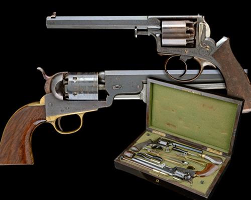 circa 1855, the first in imitation of a Colt 1851 Navy, with blued octagonal 7 1/2in. barrel signed 'COLT BREVETE', plain blued cylinder with roll-engraved scene, blued open iron frame, brass trigger-guard and grip-straps, smooth walnut one-piece grip and brushed bright articulated loading lever, the second in imitation of an 1851 pattern Adams, with blued octagonal 6in. barrel, the top-strap and flat signed 'MANUFD. BY C. DANDOY, LICENCED BY DEANE ADAMS & DEANE LONDON', plain five-shot cylinder, borderline and scroll engraved solid frame, spurless hammer, chequered walnut one-piece grip with cap-box to heel, no provision for loading lever, both pistols in fine condition with much original finish remaining; TOGETHER WITH a period mahogany case compartmented and lined in green baize in the Continental fashion containing the pistols and a host of accessories including a flask, two brass bullet moulds, two turn-screws, a loading convertible mallet cleaning rod, an oil bottle, wad-punch and two nipple keys