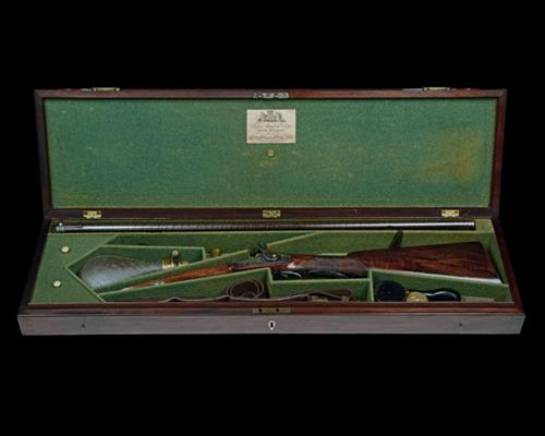 for 1815-16 and with later conversion to percussion, twist-iron 30in. barrels, the raised top-rib signed 'DOVER STREET LONDON', engraved colour-hardened breech-blocks with engraved platinum vents, fully engraved top-tang, border and scroll engraved locks signed 'JNO. MANTON & SON, PATENT', scroll engraved slab-sided hammers, walnut half-stock chequered at the wrist, engraved iron furniture including scrolled grip trigger-guard tang, mahogany brass-mounted ramrod, the whole with much, possibly original, colour and finish; TOGETHER WITH possibly the original mahogany storage case, original parchment trade label to inside of lid, the partially relined interior altered for percussion by allowing the gun to be stored with the locks attached, the case also containing a number of period accessories including a leather shot-belt, a powder flask, cap and wad tins, a turn-screw, powder measure, cranked nipple-key and sundry cleaning items and also containing a letter detailing a past sale in 1899