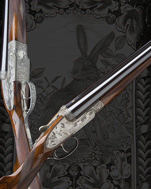 30in. nitro chopperlump barrels, the ribs engraved in script 'MODEL DE LUXE' and with fine foliate designs at the breech ends with gold ovals inlaid '1' and '2', tubes engraved 'HOLLAND & HOLLAND. 33 BRUTON STREET. LONDON.', 3in. chambers, bored approx. 1/2 and 3/4 choke, treble-grip actions with hidden third bites, side-clipped fences, toplevers with gold ovals inlaid '1' and '2', automatic safeties with gold 'SAFE' details, hand-detachable lockplates with gold-inlaid cocking-indicators, rolled-edge triggerguards, the fences exquisitely carved in high relief with bulrushes and wheat-ear bordering, the actions and furniture with superlatively carved with floral and thistle designs bordered with further wheat-ear motifs, the fore-ends engraved en suite, the lockplates finely engraved with striking scenes of mallard and geese in wetland settings, the underside of the No.1 gun with a finely engraved vignette of a capercaillie, the No.2 similarly with a buck hare, the triggerplates signed 'Ph. Grifnee', bright finishes overall, 15 3/8in. highly-figured stocks, weight 7lb. 9oz., in their brass-cornered oak and leather case with accessories and canvas and leather outer