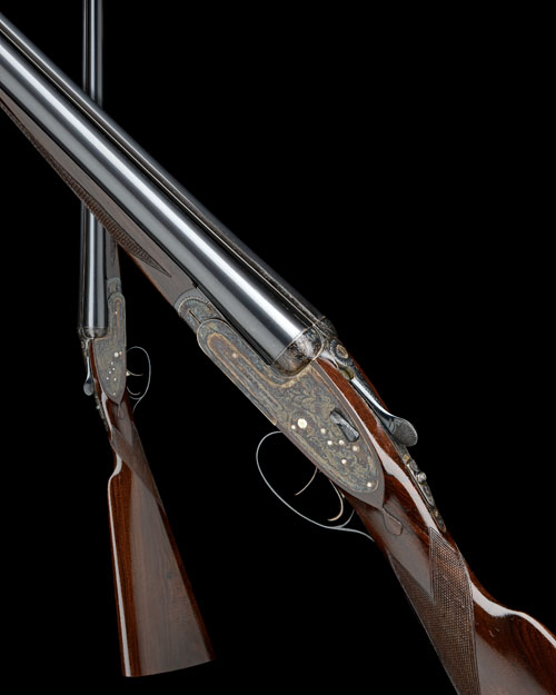 26in. nitro chopperlump barrels, 2 3/4in. chambers, bored approx. 1/4 and 1/2 choke, engraved arcaded fences, removable striker discs, automatic safety, hand-detachable lockplates, gold-inlaid cocking-indicators, rolled-edge triggerguard, acanthus scroll engraving, retaining virtually full original colour-hardening and finish, 14 1/4in. stock, weight 6lb. 2oz.