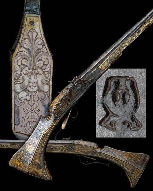 central European circa 1590 and almost certainly converted from matchlock or wheel-lock, with 47 1/2in. two-stage iron barrel with multiple moulded bands at the intersection, bulbous muzzle with bead fore-sight, armourer's stamp at breech, incomplete rusted snaphaunce lock (missing hammer and possible other internal parts) fitted over an inlet wooden filler, walnut semi fish-tailed lozenge-shaped full-stock profusely covered with inlet engraved bone panels, many featuring figures in tudor dress, the voids between with inlet bone borderlines and floral scrolls (losses, damage), the heel-plate featuring the mask of a green man over a heart bearing the initials 'I.L.' over 'M', long iron trigger-guard bow with raised finger-tang, provision for under-barrel ramrod (missing), iron surfaces with corrosion, small losses to sharp edges of wood