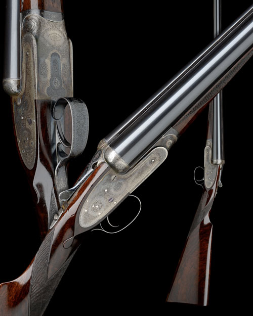 29in. nitro chopperlump barrels, raised rib engraved 'J. PURDEY & SONS. AUDLEY HOUSE. SOUTH AUDLEY STREET. LONDON. MADE OF SIR JOSEPH WHITWORTH'S FLUID PRESSED STEEL', 2 1/2in. chambers, bored approx. full choke in both, self-opening action with removable striker discs, automatic safety with gold-inlaid 'SAFE' detail, cocking-indicators, best fine acanthus scroll engraving with floral bouquets, retaining some original colour-hardening and finish, 14 1/8in. well-figured stock, weight 6lb. 12oz., in its brass-cornered oak and leather case with some accessories