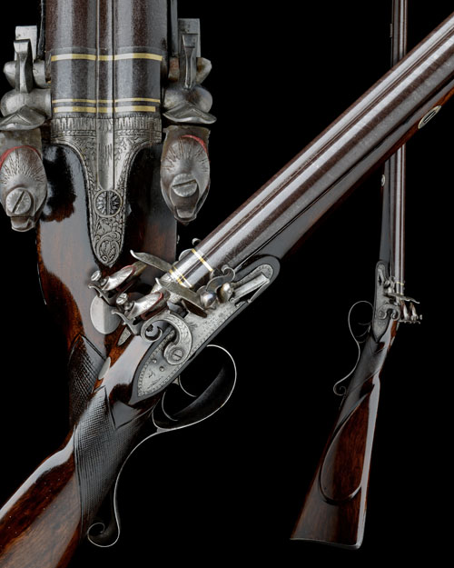 circa 1800, with twist-iron 31in. slightly shortened barrels, the narrow top-rib signed 'BLAIR AND SUTHERLANDS LONDON' (refreshed), triple gold bands to the breech, border and scroll engraved top-tang,border engraved locks, rainproof pans, roller bearings to the frizzen-springs, (engraving on locks and hammers refreshed), walnut half-stock chequered at the wrist, raised cheek-piece, (inlet repairs at toe and fore-end, cracked below left hand lock), engraved iron furniture, silver barrel-key escutcheons, silver ramrod throat and brass tipped mahogany ramrod