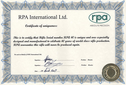 RPA INTERNATIONAL LTD. A FINE AND UNIQUE .308 WIN. 40th ANNIVERSARY COMMEMORATIVE BOLT-MAGAZINE SPORTING RIFLE, serial no. RPA40,