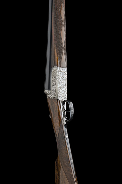 27 5/8in. (70cm) nitro barrels with raised tapered file cut rib, gold-inlaid in script at the breech end with the makers name, 2 3/4in. chambers, bored approx. true cyl. and 1/2 choke, ornately scroll-backed action, manual safety, profusely carved in low relief with scrolling acanthus and floral designs on a stippled background, bright and blued finish overall, 14 3/8in. highly-figured stock including 3/4in. rubber recoil pad, 10in. fore-end, weight 6lb. 15oz., in a leather case