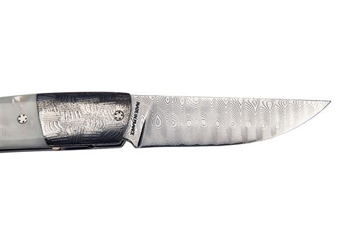 MANU LAPLACE 1515, FRANCE A FINE AND UNIQUE DAMASCUS FOLDING LOCK-KNIFE WITH POLYNESIAN MOTHER OF PEARL HANDLE,