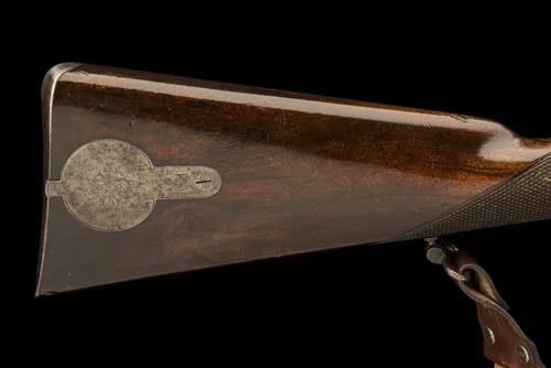 circa 1865, with round 36in. multi-groove barrel, the top at breech signed 'E.M. REILLY & CO. 315 & 502 OXFORD STREET, LONDON', replacement dove-tailed adjustable tunnel fore-sight (remnants of the original dove-tailed base remains), micro adjustable target rear-sight marked 'SUTHERLAND RIFLE SIGHT CO, NEW GLASGOW N.S.', octagonal breech section with squared breech-plug, moulded snail, scroll engraved top-tang with later Pedersoli vernier sight fitted behind, borderline and scroll engraved bar-action lock signed 'E.M. REILLY & CO. LONDON', sliding safe forwards of hammer, scroll engraved hammer breast, chequered walnut full-stock of military form, borderline and scroll engraved patchbox to right hand side of butt, iron furniture, three iron barrel bands, triple swivel set-up and jag-ended iron ramrod