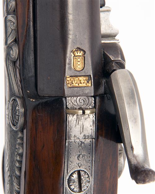 circa 1790 with later conversion from flint, two-staged Spanish form 9in. barrel with moulded band at the intersection, the forward section with carved sighting rib with applied white-metal fore-sight, the rear section with gilt barrel makers mark, possibly Portuguese, standing notch rear-sight to the top-tang (repaired), applied nipple-boss, brushed bright signed slightly curved flat lock with bevelled edge and pointed stepped tail, plain hammer with sliding safe behind, vestiges of pan remaining, walnut full-stock with bordered chequered panels to grip and fore-end, each decorated with white-metal pins, white metal shield-shaped escutcheon to wrist with a further oval escutcheon below engraved '1', engraved iron furniture including bulbous long-side spurred butt-cap, trigger guard tang and bow and winged sidenail escutcheon, set trigger, plain barrel keys and turned ramrod thimbles with iron mounted ebony ramrod