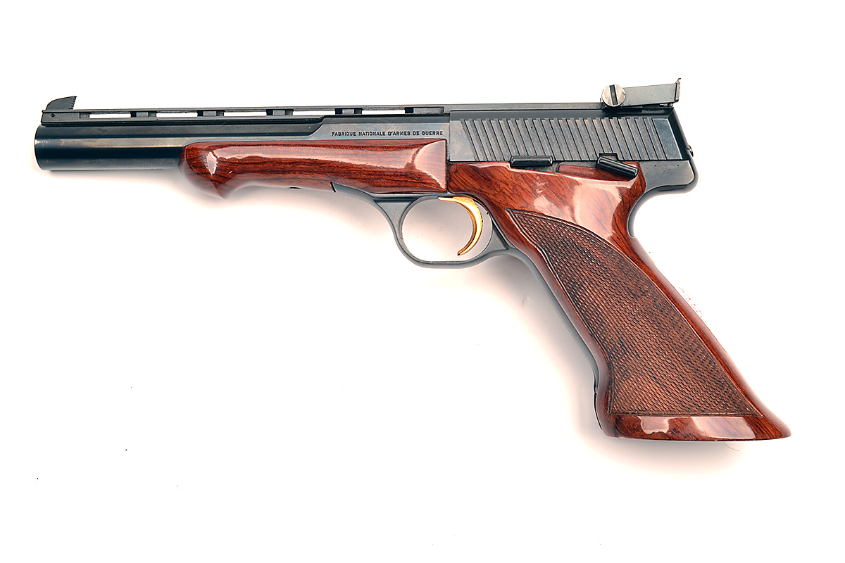 A .22 (L/R) LEFT-HANDED SEMI-AUTOMATIC TARGET-PISTOL SIGNED BROWNING, MODEL '150', serial no. 29834T3, with 6 3/4in. blued bull-barrel, raised ventilated rib, adjustable sights, chequered walnut right hand grip and schnabel fore-end, much finish remaining together with a full flap leather holster