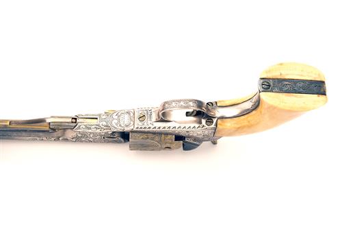 for 1863, with round silver-plated 5 1/2in. barrel signed 'ADDRESS COL. SAML COLT NEW-YORK U.S. AMERICA' , engraved band and scrolls at muzzle, the first three fifths of the barrel and side-cheeks engraved with open American scrolls with a circle-punched ground, stepped and fluted cylinder (traces of gilding), the scroll engraving repeated over each chamber and around the rear-end of cylinder, silver-plated scroll engraved open frame, engraved and gilt-washed hammer, partially engraved silver-plated grip-straps and trigger guard, gilt-washed trigger-blade and creeping rammer (faded), smooth ivory grips, complete with a possibly later cedar and pine storage case and including a fine Dixon flask, an unopened box of 'Colt's Patent' combustible wire cartridges, and unsigned snail capper, iron 'Colt Patent' bullet mould, a tin of eley caps, an oil bottle and later nipple key