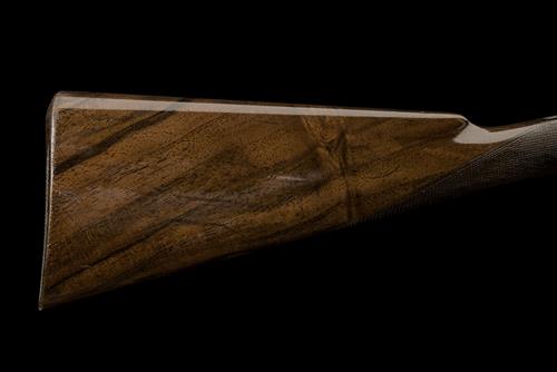 28in. sleeved nitro barrels, 2 1/2in. chambers, bored approx. 1/4 choke in both, some pits, scroll-back treble-grip action incorporating J. Deeley and L.B. Taylor patent hand-detachable locks, patent no. 17731 of 28th July 1897 with improved 'lighter pull-off' modification, patent no. 10567 of 7th May 1907, use number 1946, A.E. Lard patent single selective trigger, patent no. 3952 of February 2nd 1899, use number 1438, the toplever engraved 'Westley Richards Patent One Trigger', hinged floorplate, barrel selector switch with gold-inlaid 'R' and 'L' details, automatic safety with gold-inlaid 'SAFE' detail, fine acanthus scroll engraving surrounding the maker's name within a cartouche, the triggerguard engraved with a pointer, 14 1/2in. replacement stock, fore-end with horn finial, weight 6lb. 7oz., in its leather case
