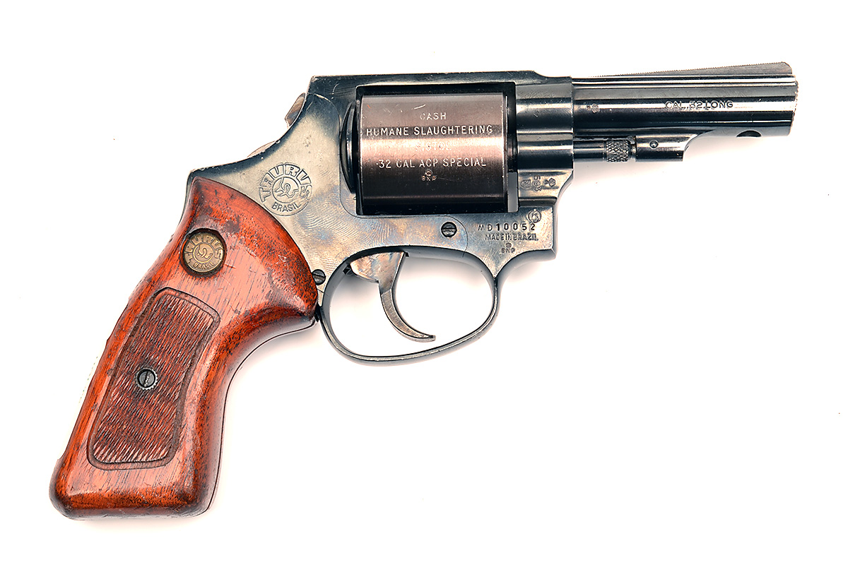 A .32 (ACP) SINGLE SHOT HUMANE DESPATCH PISTOL SIGNED TAURUS, MODEL 'ACCLES & SHELVOKE CASH', serial no. MD10052, specially converted in the UK with 3in. ported barrel, single-shot swing-out cylinder, blued solid frame and chequered wood grips