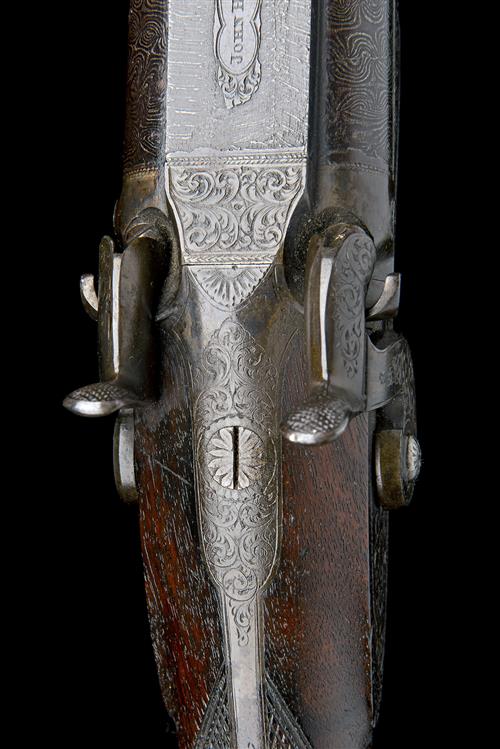 circa 1860, with heavy etched fine damascus browned 30in. side by side barrels, the broad top-rib signed behind the rear-sight 'JOHN HAYTON GRAHAMS TOWN 7430' within a complex engraved border, the section of rib forwards of the rear-sight graduated in one inch increments for measuring trophies, dove-tail for fore-sight (absent), blued six leaf 'African' rear-sight with platinum lines to each blade and a further standing leaf, none notched, colour-hardened carved and moulded breech-blocks with percussion fences, platinum plugs and full scroll engraving to the rib-end, borderline and scroll engraved colour-hardened long top-tang, border and scroll engraved bar-action colour-hardened locks signed 'J. HAYTON', scroll engraved en-suite hammers (one hammer screw absent), chequered walnut half-stock with large rectangular patch-box to right hand side of butt with scroll engraved hinge and lid, the central portion of lid with a circular panel engraved with a prowling lion, colour-hardened smooth iron heel-plate with triple-stepped spur with border and scroll engraving, engraved replacement trigger-guard bow from another with raised chequered pistol-grip tang, plain etched damascus ramrod thimbles and replacement ramrod, the rifle retaining all its original colour-hardening, the browning darkened, the whole with the appearance of little use and light storage marks only