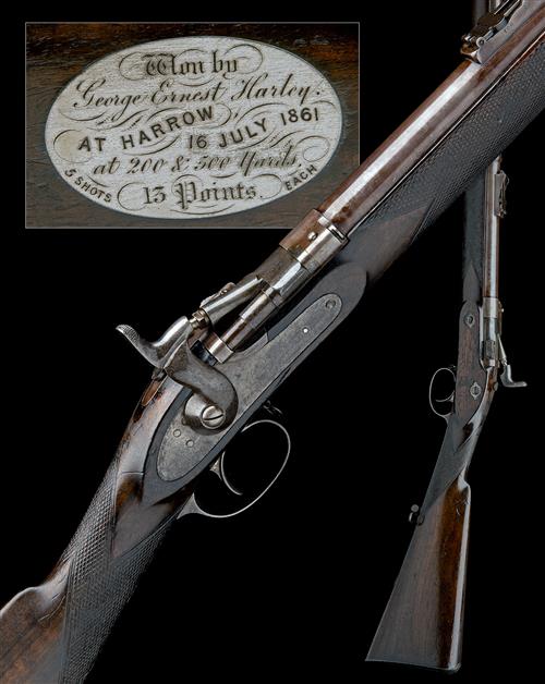 dated for 1861, with 30 1/2in. round barrel, commercial Birmingham proofs, block and blade fore-sight, elevating ladder rear-sight, plain flip-open breech-block with spring thumb-catch, plain lock signed 'ISAAC HOLLIS & SONS, MAKER TO HER MAJESTY'S WAR DEPARTMENT', walnut full-stock chequered at the wrist and fore-end, the right hand side of butt inlet with an oval white-metal plaque engraved 'WON BY GEORGE EARNEST HARLEY AT HARROW, 16 JULY 1861 AT 200 & 500 YARDS, 13 POINTS, 5 SHOTS EACH', regulation iron furniture and jag-ended iron clearing rod, finish faded and browned