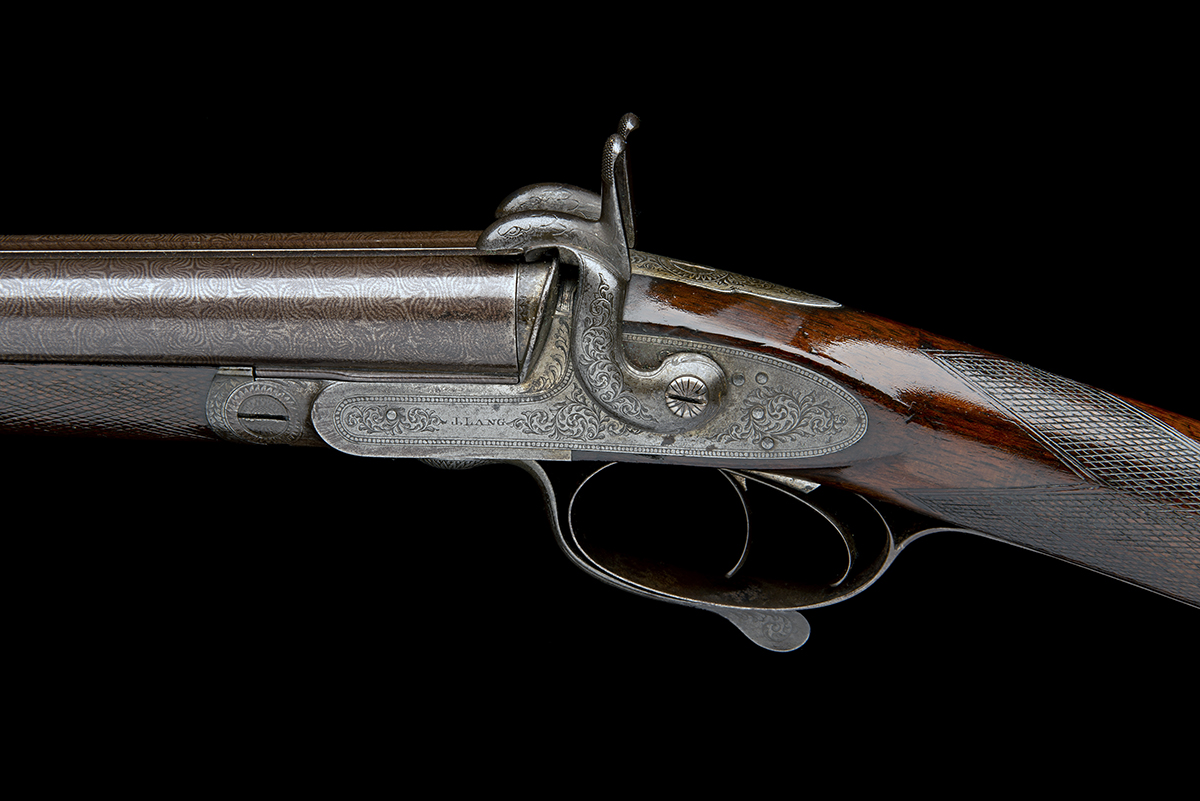 circa 1860, with rebrowned damascus 29 3/4in. side-by-side barrels, the top-rib signed 'JOSEPH LANG 22 COCKSPUR STREET, LONDON' (rubbed, illegible in places), bead fore-sight, shallow carved percussion fences, borderline and scroll engraved short top-tang, borderline and scroll engraved bar-action locks with dolphin headed engraved hammers, the locks signed 'J. LANG' on the bars, walnut butt-stock chequered at the wrist, engraved iron furniture, single bite swing-lever opening, fully chequered walnut splinter fore-end with cross-key fixing and complete with a period walnut storage case possibly refitted for this shotgun and lined in green baize with replacement trade label to inside of lid