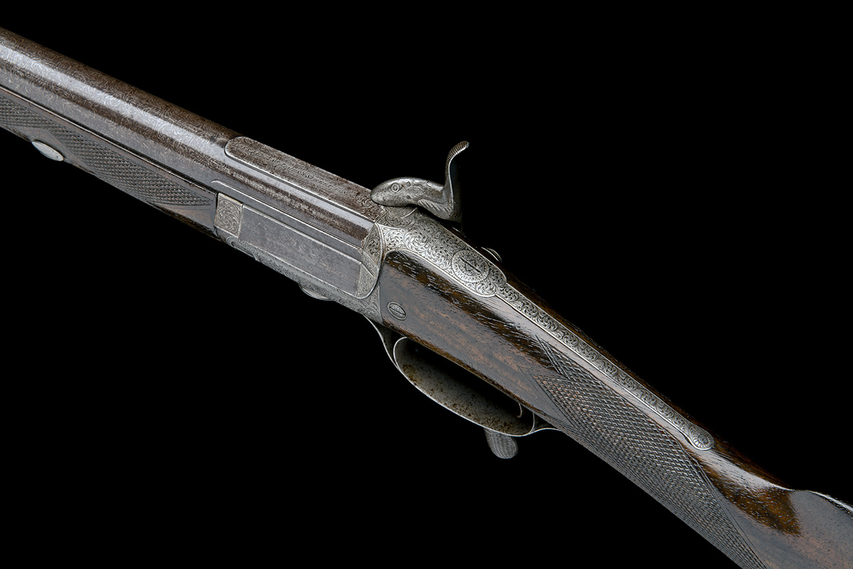 for 1864, with round damascus 30in. barrel, moulded short ribs to top and sides of breech, the top signed 'BOSS & CO, 73 ST JAMES'S STREET, LONDON', bead fore-sight, scrolls and band engraved at breech, moulded off-set pin support, carved shallow fence, long borderline and scroll engraved top-tang, border and scroll engraved back-action lock signed 'BOSS & CO', en-suite hammer, border and scroll engraved rounded action with Jones-type swing under-lever, chequered walnut straight hand butt-stock, engraved iron furniture, white metal oval escutcheon to underside engraved with an eagle and snake device, chequered walnut splinter fore-end with moulded horn tip, cross-key fastener and fully engraved iron