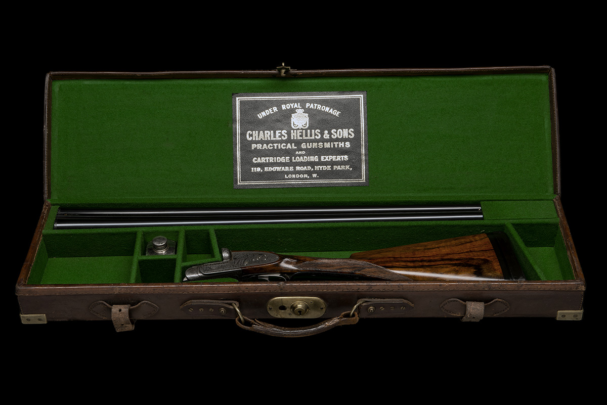 26in. nitro chopperlump barrels, rib engraved 'CHARLES HELLIS & SONS LTD. 121 & 123 EDGEWARE ROAD HYDE PARK LONDON W.' and gold-inlaid '2' at the breech end, 2 1/2in. chambers, bored approx. imp. cyl. and 3/4 choke, toplever gold-inlaid '2', automatic safety with gold-inlaid 'SAFE' detail, gold-inlaid cocking-indicators, rolled-edge triggerguard, retaining very slight traces of original colour-hardening and finish, 14 1/2in. figured stock including 1/2in. ebonite extension and 3/4in. rubber recoil pad, weight 6lb. 6oz., in a brass-cornered leather case