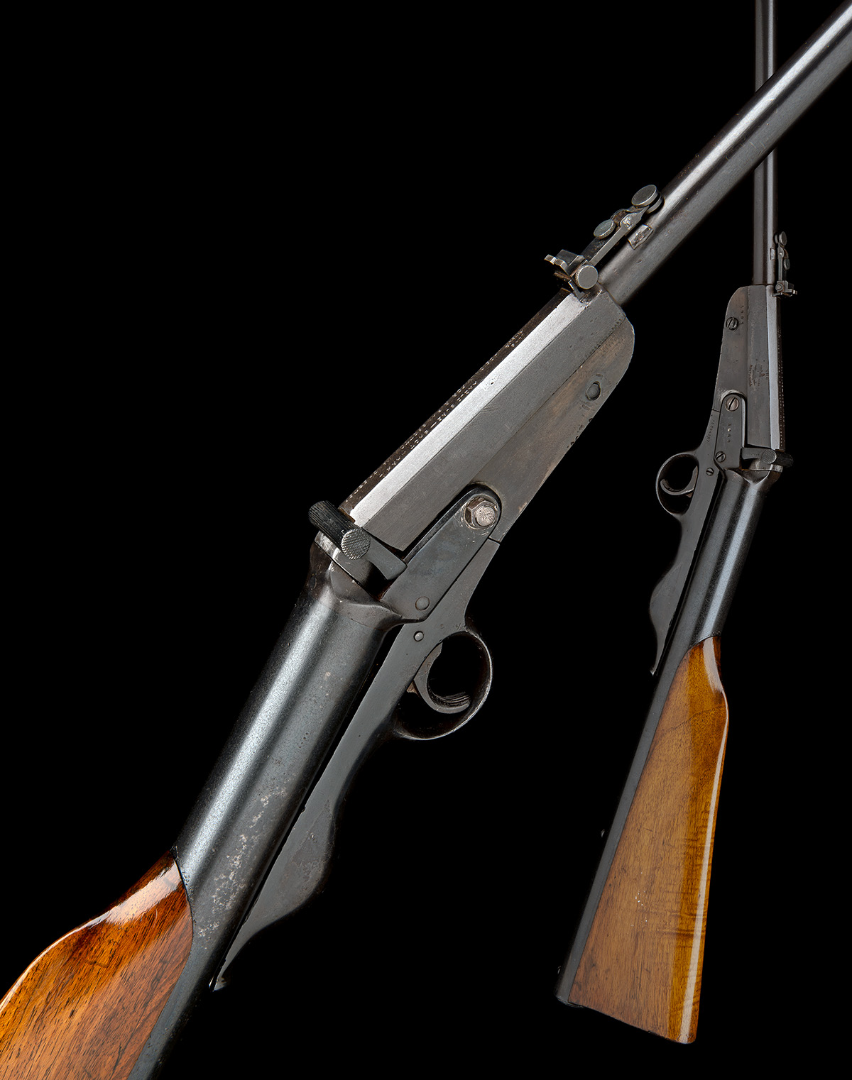 circa 1907, with two stage 20 1/2in. barrel, dove-tailed front and adjustable rear-sights, the top-flat signed 'ANGLO SURE-SHOT MARK 1, MADE ONLY FOR R. RAMSBOTTOM, MANCHESTER' and 'COX'S PATENT', the side of breech stamped 'THE BRITANNIA' surrounding a seated figure of Britannia bisecting the legend 'REGD TRADE MARK', stirrup barrel locking latch, slanted air-chamber with applied walnut comb, cocking link housing the trigger-unit stamped 'RD394207', the whole re-finished