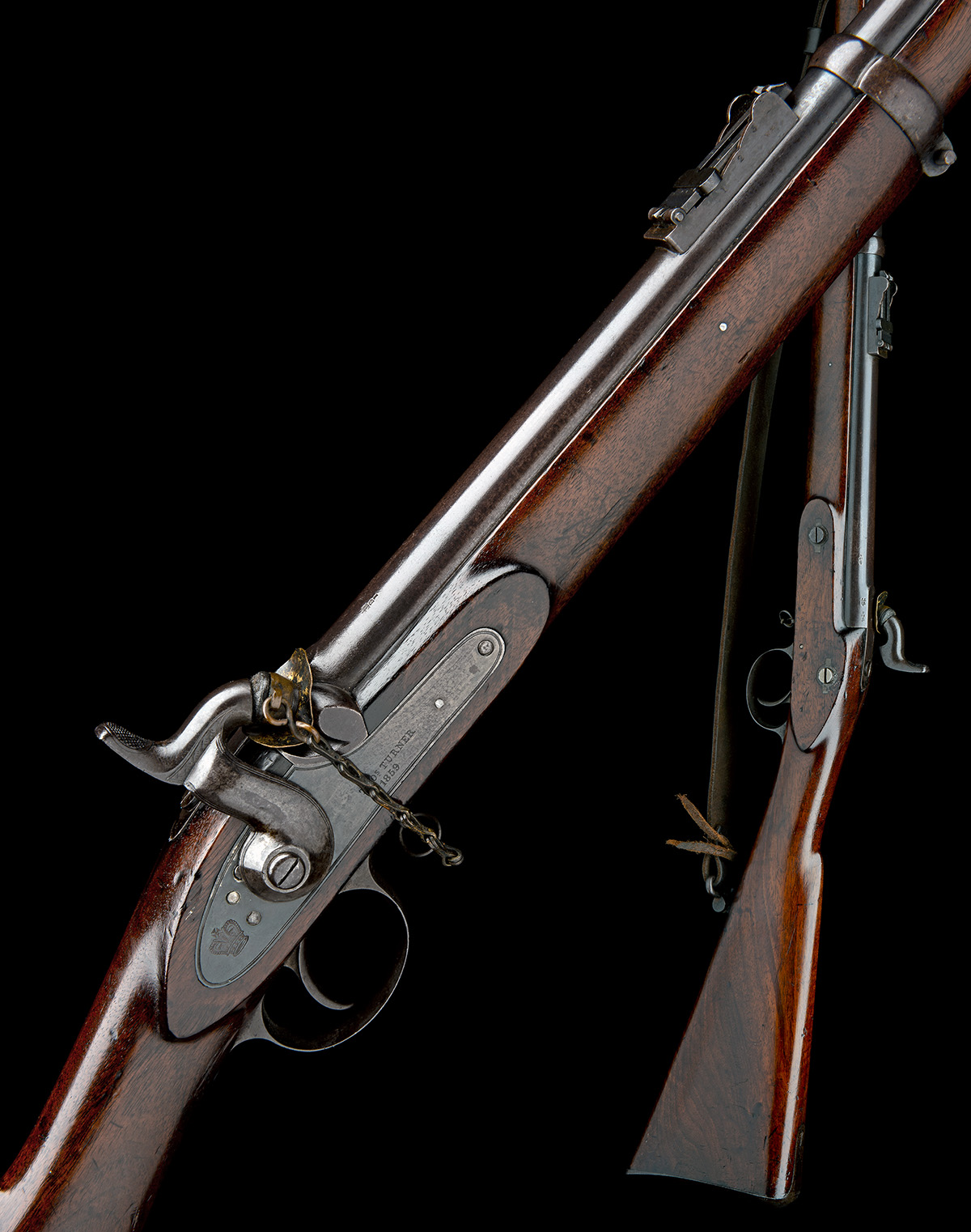 dated for 1859 with 33in. barrel, block and blade fore-sight, elevating ladder rear-sight, military proofs, plain borderline engraved lock signed 'THOS. TURNER 1859' to the bar and with 'V.R.' to the tail, chained nipple protector, walnut three-quarter stock bayonet lug near muzzle, iron furniture, two iron barrel-bands, jag-ended iron ramrod and a later leather sling, strong amount of finish remaining