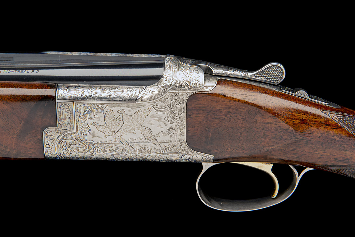 26in. nitro barrels with 6mm ventilated matt top-rib, 2 3/4in. chambers, bored approx. improved cyl. and 1/4 choke, hold-open toplever, manual safety with integral barrel selector switch, gold-washed single trigger, foliate scroll engraving surrounding vignettes of flushed fowl and feather, silver finish, 14 1/4in. stock including buttplate, weight 6lb. 10oz., together with a Holland & Holland green canvas and leather slip